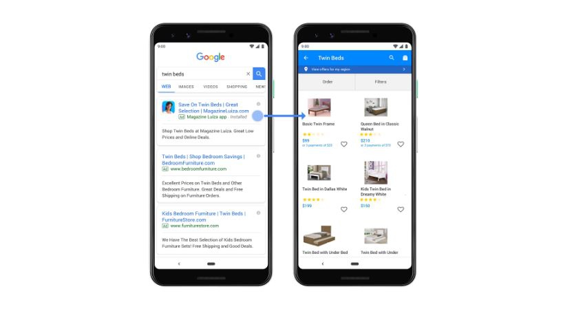 Для поиска новых клиентов и выстраивания отношений с уже существующими очень важно направлять их на нужные страницы. Поэтому в течение следующих нескольких недель Google разрешит размещать «глубокие ссылки» на приложения в Google Рекламе и введет более надежную систему отчетов для веб-ресурсов и приложений. Переходя по ссылке из объявления на странице Поиска, Покупок или КМС, пользователи будут попадать в нужный раздел мобильного приложения (если оно уже установлено). Это значит, что клиенты сразу смогут совершить желаемое действие (сделать покупку, заказать билеты или доставку еды) тем способом, который предпочтителен для конкретного бренда. Такой подход помогает рекламодателю лучше понять потребности пользователей и измерить результаты. По предварительным оценкам, в среднем «глубокие ссылки» на приложения приводят к росту коэффициента конверсии в два раза.