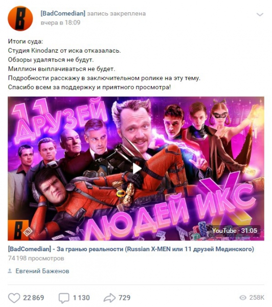 Киностудия Kinodanz отказалась от своих претензий к блогеру Евгению Баженову, известному как BadComedian. Об этом обзорщик сообщил на страничке своей группы «ВКонтакте».