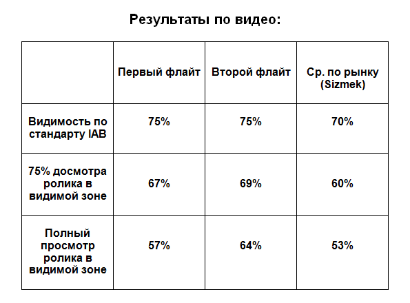 Проведённый аудит первых флайтов кампании включал мониторинг видеоразмещений и баннерной рекламы, в том числе программатических закупок. Результаты показали, что основные параметры качества кампании не только соответствуют среднерыночным показателям, а нередко превосходят их.