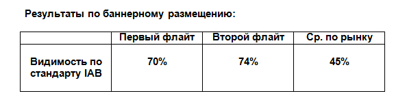 Результаты по баннерному размещению также превысили среднерыночные показатели. Оптимизация, проведенная по итогам первого флайта, позволила улучшить viewability рекламы. Несмотря на уже удовлетворительные результаты, баннерная реклама является зоной для дальнейшей оптимизации размещения. Однако оптимизация viewability в баннерной рекламе представляет собой достаточно серьезную работу со списком площадок и набором форматов, которые обеспечивают высокие результаты при сохранении эффективных ценовых показателей. На данный момент все еще нет возможности отказаться от ручной оптимизации на 100%, даже при наличии инструментов автоматизации.