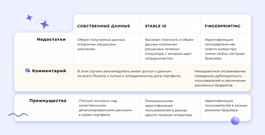 - узкое покрытие аудитории по сравнению с third-party cookies, связанное с уникальностью Stable ID исключительно в рамках одного телеком-оператора.