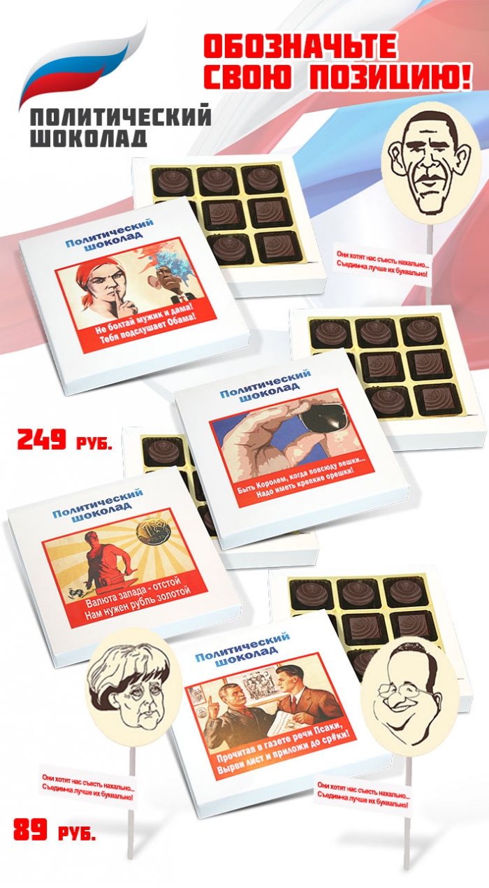 «Политический шоколад» с Бараком Обамой, Франсуа Олландом, Ангелой Меркель станет подарком «на злобу дня», считают в «Конфаэль». Там подчеркивают, что стиль и цена коллекции соответствует кризисной ситуации: одна упаковка стоит 249 рублей.