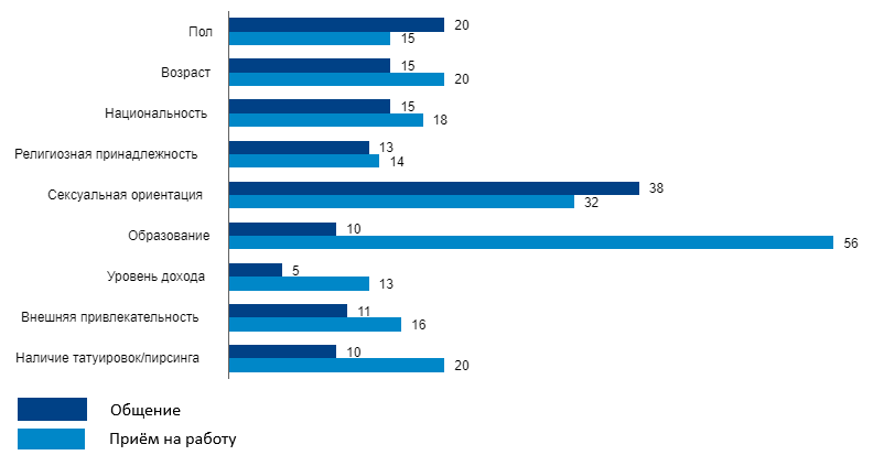 В каких ситуациях проявляется дискриминация? Мы взяли одну из наиболее болезненных — прием на работу, и сравнили ее с более простой, но массовой и характерной — общением. Вопрос респондентам звучал так: «Представьте, что Ваша задача — найти нового сотрудника. Насколько важны при описании следующие характеристики? (перечень)». Аналогично звучал и вопрос об общении: «Представьте, что Вам описывают человека, с которым Вы могли бы общаться…».
