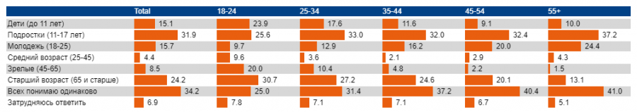 Но неожиданности на этом не закончились. Несмотря на формальное равенство, во взаимоотношениях представителей разных поколений гармония не царит. Только треть респондентов умеет (они так думают) одинаково хорошо понимать и молодых, и старых. Люди всех возрастов более-менее хорошо понимают людей среднего возраста 25 — 45 лет, но гораздо хуже понимают детей, подростков и стариков. Но настоящая неожиданность в другом: среди всех возрастных групп есть заметная доля респондентов, не умеющих находить общий язык с людьми своего поколения. А это значит, что коммуникации с ними надо строить как-то иначе, учитывая этот нюанс. Другими словами, повод присмотреться к теме внимательно явно есть.