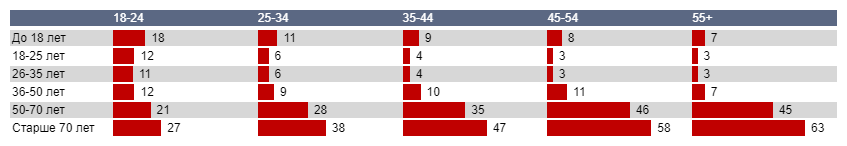 Правда, есть нюансы. Среди тех, кто не хотел бы видеть на экране суровую правду жизни, преобладают… мужчины. Здесь и далее, сравнивая показатели, мы будем основывать свои выводы только на статистически значимых различиях. Если говорить о возрастных стратах, то лидируют с большим отрывом в нежелании видеть на экране «правду жизни» люди старше 55. Молодые, в особенности, женщины в этом смысле гораздо более толерантны, хотя априори можно было бы предположить обратное.