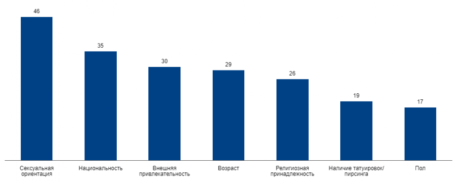 Наличие в нашем обществе дискриминации по тем или иным признакам — секрет Полишинеля. Что бы ни говорили официальные источники, она есть. Но вот по каким именно признакам она сильна — это вопрос. Представления общественного сознания отличаются от реальности, хотя бы в силу того, что находятся в зависимости от медийной силы тех или иных групп. Скажем, уровень дискриминации по полу, о которой так беспокоятся феминистки, как показывают данные опроса, существенно ниже, чем по национальности и заметно уступает дискриминации по возрасту. Причем, последняя обычно замалчивается, в отличие от, например, дискриминации по сексуальной ориентации.