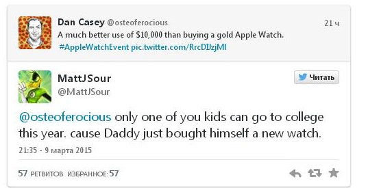Прямо во время презентации Apple, прошедшей накануне в Сан-Франциско, конкуренты зашли в социальные сети и начали высмеивать новинки — легкий MacBook и «умные» часы Apple Watch. Предметом шуток стал сравнительно небольшой срок заряда и другие недостатки часов, которые производители решили «обыграть» в свою пользу.