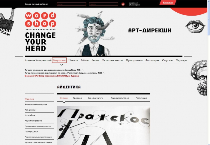 В рамках годового обучения студенты не только изучают композицию, шрифты, теорию брендинга, компьютерную графику, аудит бренда и многое другое, но и работают над реальными заказами. Например, в этом году студенты факультета "Айдентика" за год сделали фирменный стиль Института Пушкина (центр изучения русского языка во всем мире) и фирменный стиль 10 Подмосковным городам (заказ Правительства Московской области).