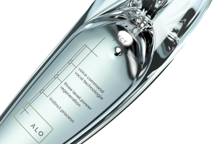 В прозрачном корпусе из натуральных материалов заключена «начинка» из алюминиевого сплава, что делает устройство легким и прочным. Эластичное внешнее покрытие позволяет смартфону адаптироваться к руке владельца. При этом у Alo нет привычного экрана: предполагается, что он управляется голосовыми командами, а медиаконтент воспроизводится в виде 3D-голограмм.