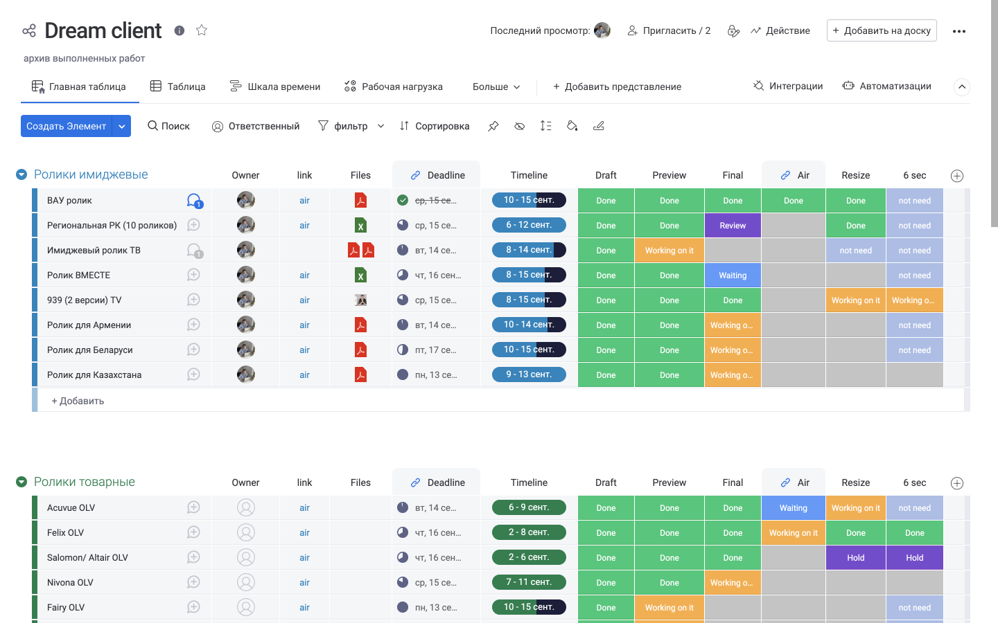 Управление проектом в Monday помогает всем участникам забыть про длинные ветки имейл-сообщений. Вместо этого у нас вся информация по проектам — в одном месте. Актуальные задачи, документы, таймлайны всегда доступны онлайн в один клик. Даже после завершения проектов у клиента всегда есть доступ к архиву. Мы относительно недавно ввели эту опцию и уже получаем положительный фидбэк.