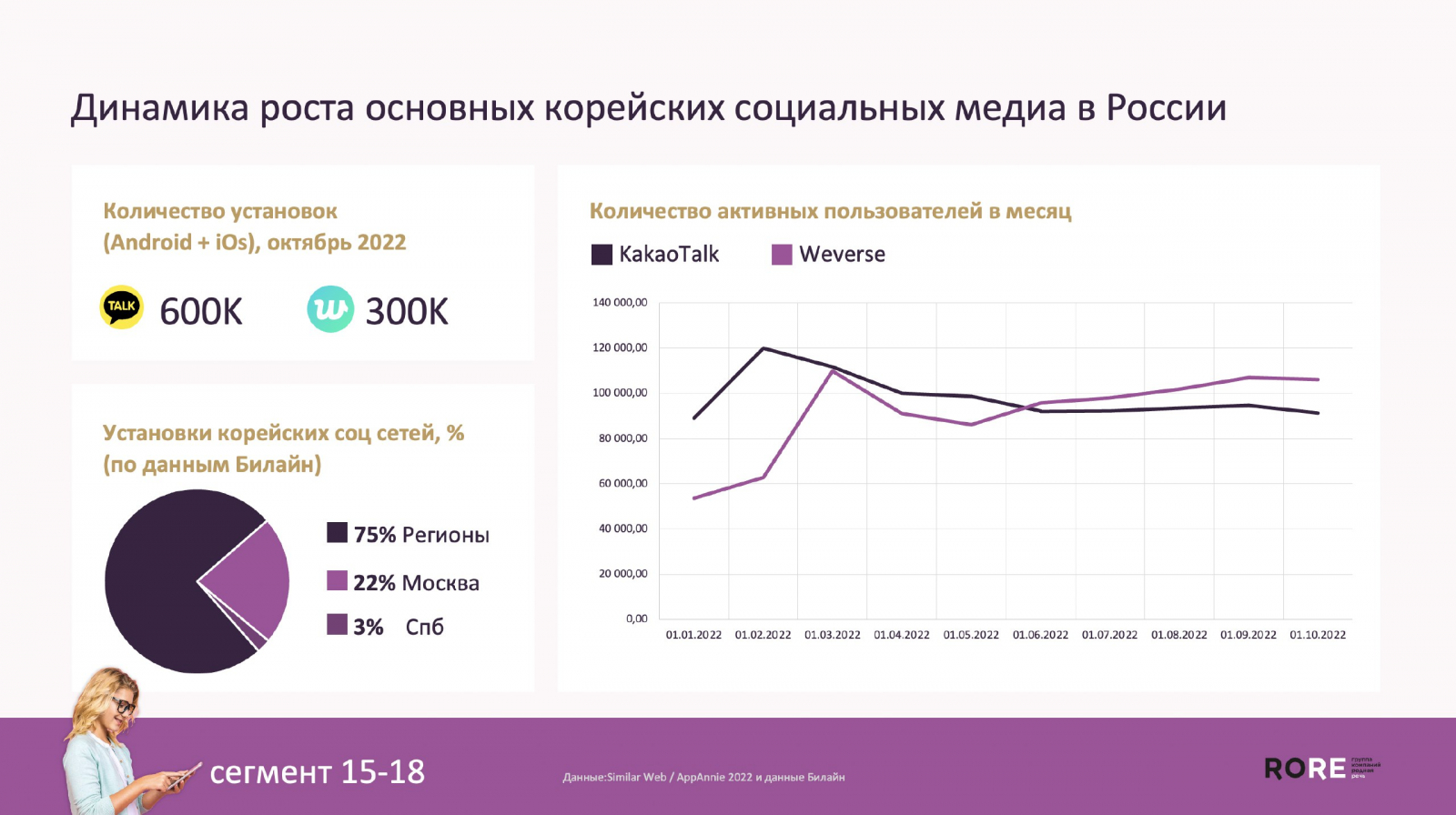 Подростки в возрасте 15−18 лет перешли на корейские платформы — по данным App Annie, количество установок приложений KakaoTalk и Wevers с марта превысило 800 тыс. Молодёжь активно интересуется такими площадками под влиянием корейской поп-культуры и южнокорейских инфлюенсеров в TikTok.