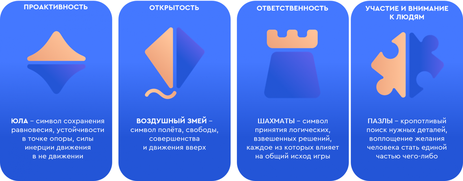 Любой кампании по продвижению помогает правильно подобранный визуал. Поэтому при разработке логотипов ценностей мы учитывали два критерия: они должны быть понятны и объединены одной идеей. После анализа разных вариантов решили остановиться на метафоре игры. Юла, воздушный змей, шахматы и пазлы — знакомые с детства образы. Запомнить их не составляет труда, ведь они отзываются на уровне чувств и формируют прочные ассоциации. Стоит отметить, что все образы мы подбирали с участием сотрудников банка.