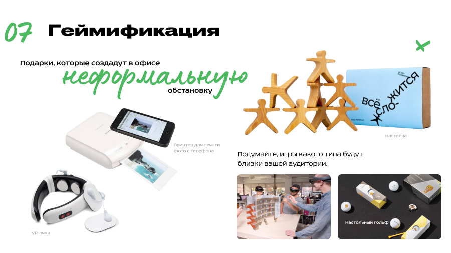 Геймификация всё глубже проникает в самые разные сферы нашей жизни, от образования до здравоохранения. Неудивительно, что этот феномен стал одним из основных трендов корпоративной сувенирной продукции. Подарки из этой категории делятся на два основных направления: онлайн и офлайн. К первому можно отнести приложения и игры для мобильных устройств, а ко второму — настольные игры, конструкторы и пазлы из дерева, которые можно собрать и самостоятельно разукрасить, а также наборы для спортивных активностей вроде настольного гольфа. Найдите тип игры, который будет близок вашей аудитории.