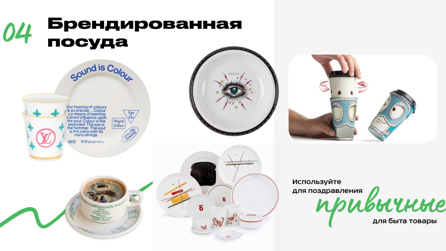В последнее время кафе и рестораны активно кастомизируют свою посуду. Индустрия подарков не отстаёт и предлагает посуду в качестве эффективного инструмента для продвижения брендов: она в течение дня находится в поле зрения, а вместе с ней и брендинг компаний. Также это всесезонный и универсальный подарок. Используйте посуду и другие бытовые предметы, которыми человек пользуется в течение дня.