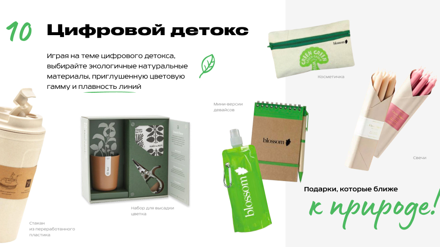 Чем быстрее меняется этот мир и чем больше информации мы вынуждены обрабатывать каждый день, тем выше становится спрос на цифровой детокс. Соответственно растёт и актуальность подарков, которые помогают хотя бы ненадолго отключиться от повседневной суеты, информационного шума и гаджетов, сбежать во внутренний мир или почувствовать себя ближе к природе. Играя на теме цифрового детокса, выбирайте экологичные натуральные материалы, приглушённую цветовую гамму и плавность линий.