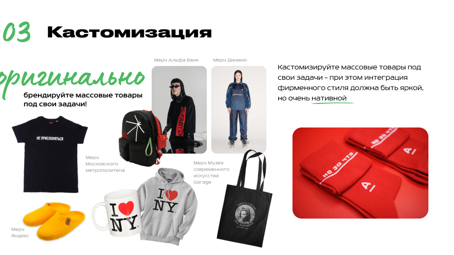 Корпоративный мерч уже давно стал инструментом продвижения компаний. При этом кастомизация позволяет добавить брендированной одежде и другой атрибутике уникальность: например, меняя их таким образом, чтобы они отражали индивидуальность обладателя или подчёркивали его сопричастность ценностям, которые транслирует бренд. Люди хотят выделиться, и бренды могут помочь им в этом с помощью кастомизации массовых товаров под свои задачи. При этом интеграция фирменного стиля должна быть яркой, но нативной.