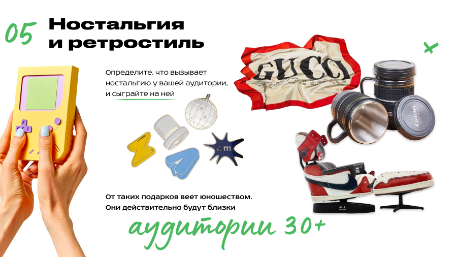 Тренды прошлых десятилетий часто обретают новые волны популярности, возвращаясь к нам в переосмысленном виде. Подарки, выполненные в стилистике того или иного десятилетия, часто ассоциируются с юношеством и романтикой у тех, чей период взросления пришёлся на это время. Например, большой популярностью у людей, кому за 30, пользуются элементы эстетики девяностых: яркие оттенки, зернистая текстура, граненые стаканы, эмалированная посуда, клетка, флаги, значки и деревянные изделия. Определите, что вызывает ностальгию у вашей аудитории, и сыграйте на ней.