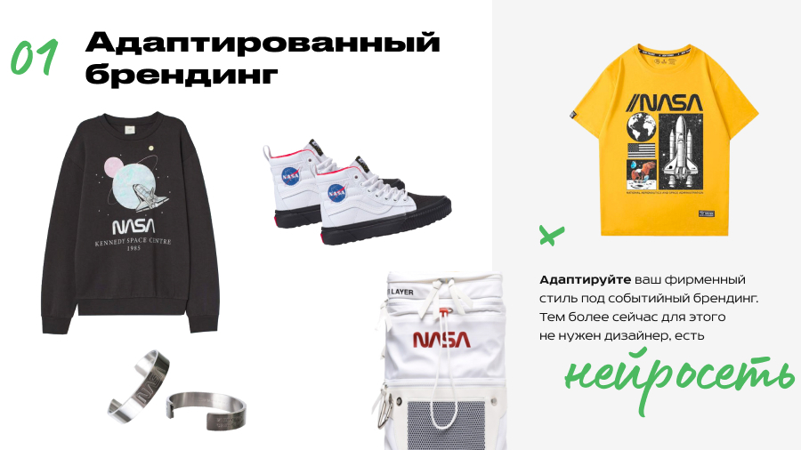Главная проблема брендированных товаров — сам брендинг. Как правило, при разработке фирменного стиля компании дизайнеры фокусируются на базовых решениях нанесения, которые затем используются по инерции и в оформлении сувенирной продукции. Однако современные бизнес-подарки требуют адаптации брендинга под определённое событие, носитель и аудиторию, которой они предназначены. Адаптируйте ваш фирменный стиль под событийный брендинг. Тем более для этого теперь не нужен дизайнер — есть нейросеть.