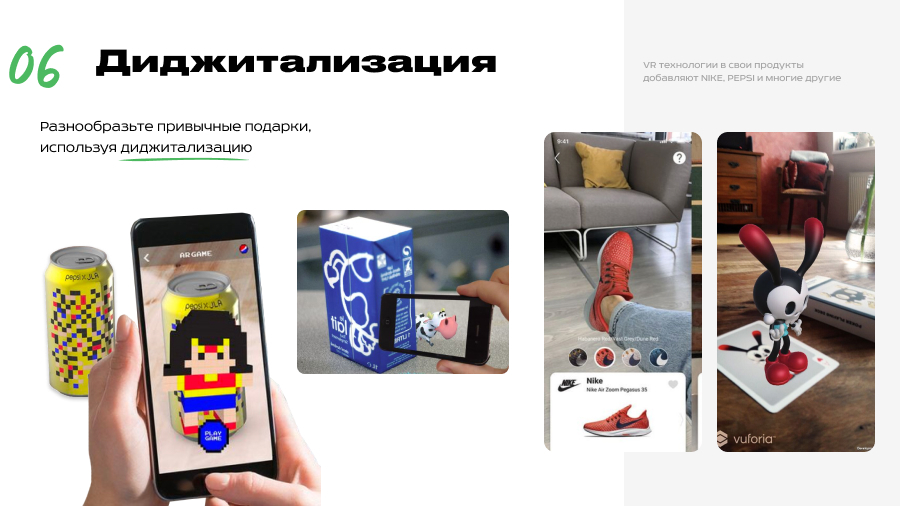 Метавселенные, NFT, дополненная реальность и другие технологии получают всё большее распространение и оказывают растущее влияние на жизнь людей. Этот тренд коснулся и индустрии подарков, что вполне закономерно, ведь любой презент будет выглядеть интереснее, если, например, приложить к нему цифровое поздравление или как-то обыграть технологию дополненной реальности. Разнообразьте привычные подарки с помощью диджитализациии.