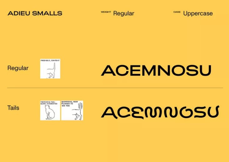 Новый шрифт основан на уже имеющемся Adieu (тоже от Good Type). Для его преобразования дизайнеры черпали вдохновение… из кошачьих хвостов. Команда креаторов наблюдала за тем, как кошки могут скручивать свои хвосты в различных ситуациях, а затем использовала эти образы в начертаниях букв.