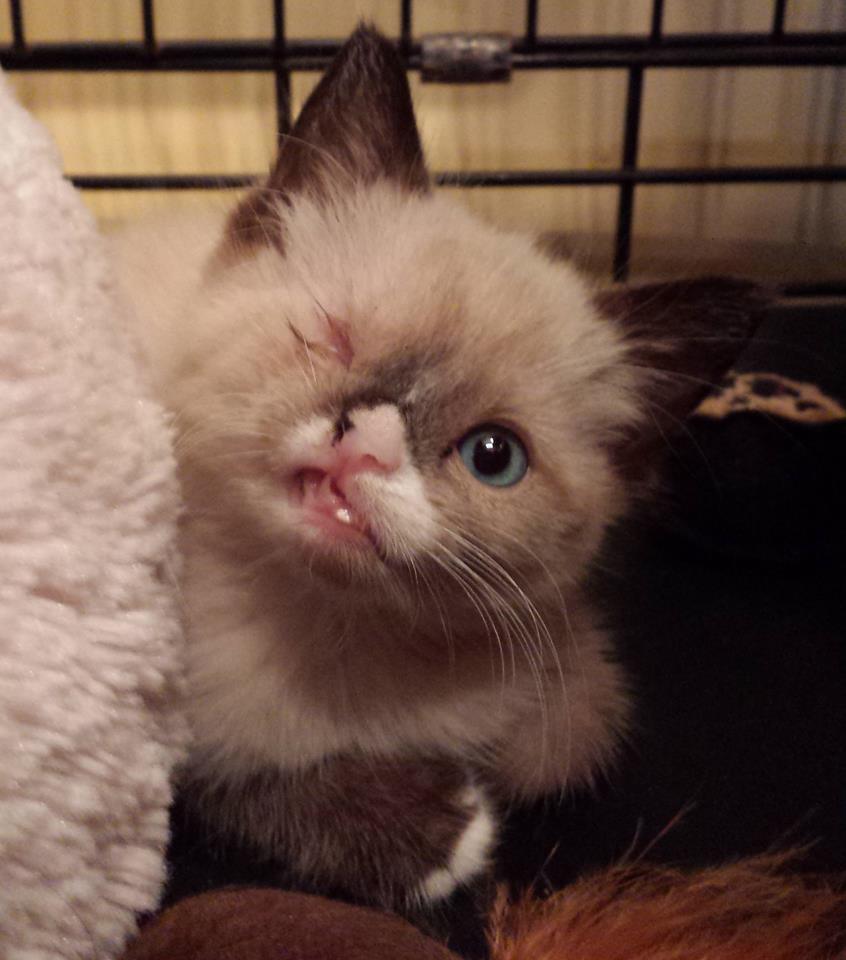 Приемная мать Блазер Шаффер подобрала беднягу на улице. Без глаза, в блохах и со сломанной челюстью она принесла его в местный приют. После медицинской диагностики у кота-пирата были зафиксированы инфекционный вирус и шумы в сердце, после чего было назначено лечение.