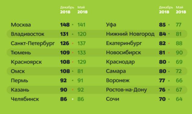 По сравнению с прошлым годом индекс уменьшился в Санкт-Петербурге, Казани, Екатеринбурге, Новосибирске, Красноярске. Максимальное падение зафиксировали в Тюмени, где индекс снизился со 133 до 109 пунктов. В Перми и Челябинске остался практически без изменений.