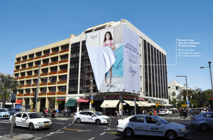 Бренд Dove в очередной раз постарался поднять самооценку женщин, выгодно использовав для воплощения этой социальной миссии возможности наружки. На билборде, который был размещён в Тель-Авиве, изображена девочка на фоне бассейна. Стесняясь собственной внешности, она прикрывается куском плаката и олицетворяет собой множество юных девушек, которые не видят собственной красоты. Над рекламой работало агентство McCann Erickson.
