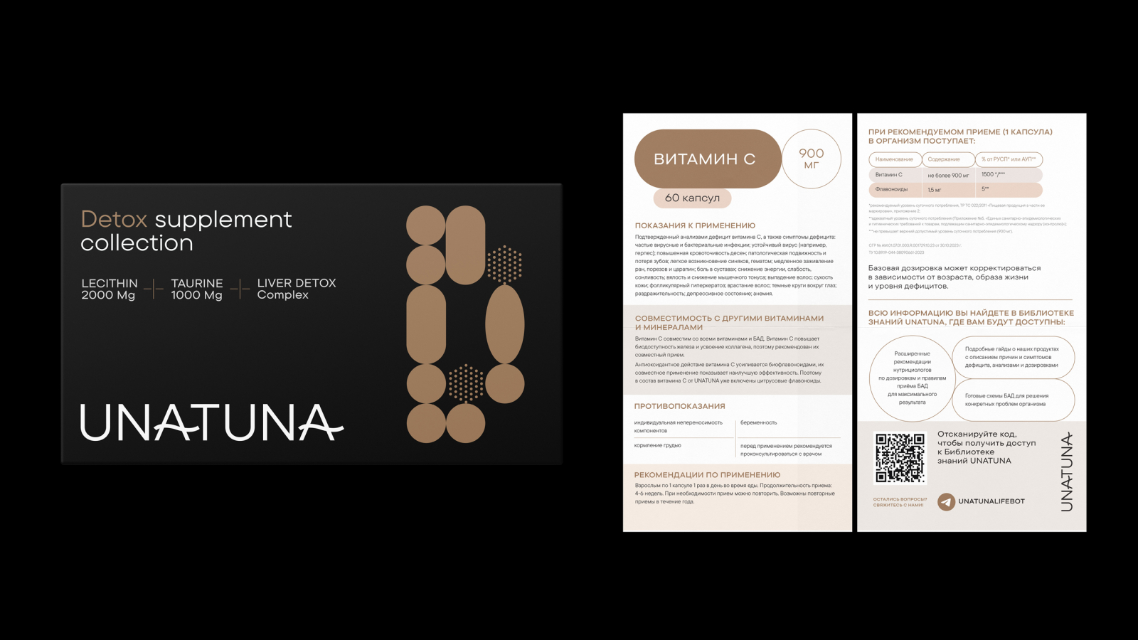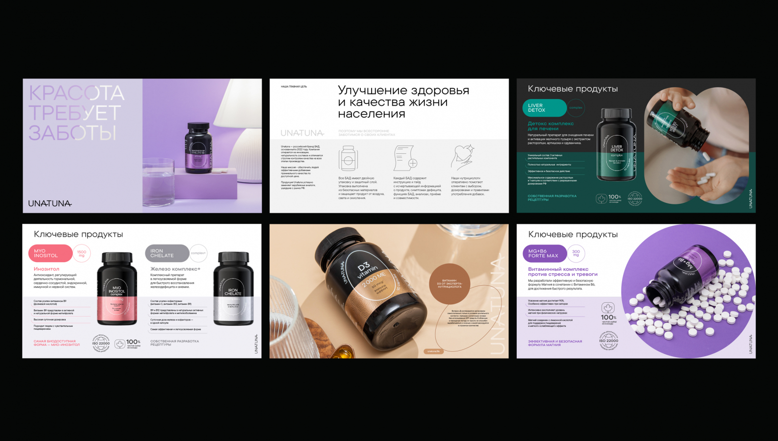 Нашей задачей было сделать айдентику, которая бы органично дополнила упаковку и подчеркнула экспертность и премиальность бренда. Мы разработали визуальный язык, вдохновленный лекарственными формами: капсулами, таблетками, порошками. Их геометрия легла в основу лаконичных и запоминающихся композиций. Айдентика стала расширенной версией дизайна упаковки, которая как дополняет визуальный стиль препаратов, так и существует самостоятельно. А сердце из двух капсул стало символом миссии UNATUNA: «Здоровье — это выбор».