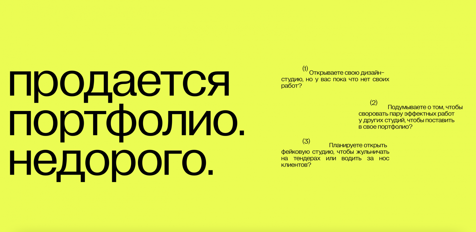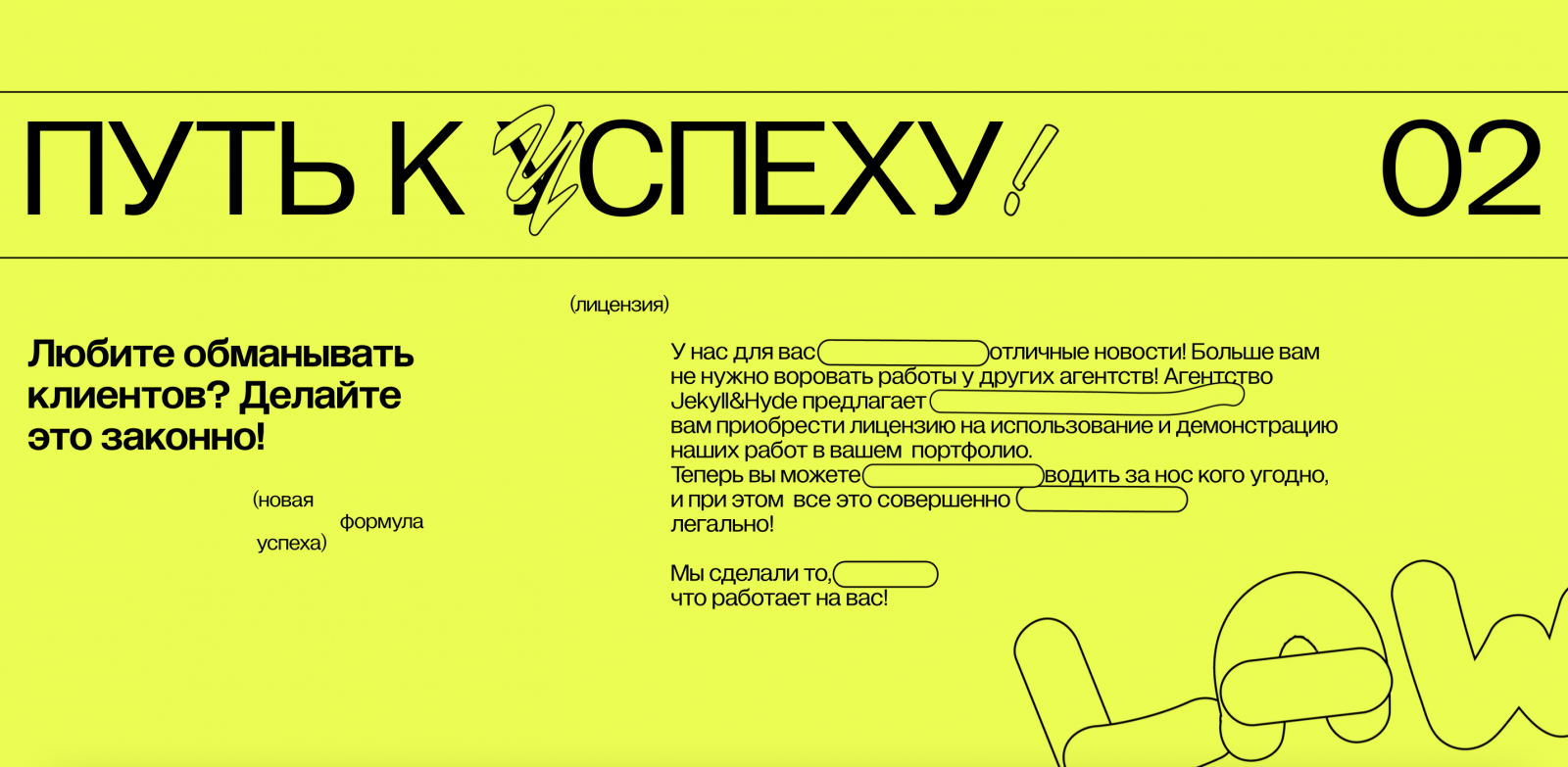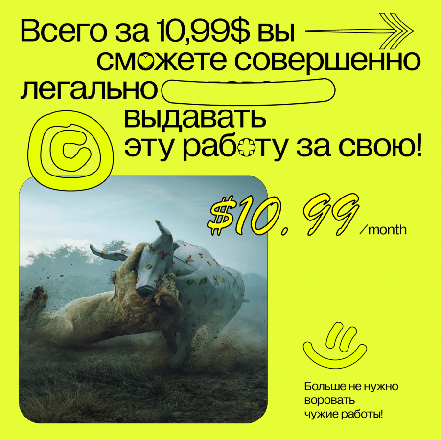 Многие креативные агентства сталкиваются с проблемой воровства кейсов. Так, портфолио команды Jekyll&Hyde украли 34 раза — не только коллеги из России, но и из Китая. Сегодня проблема нарушения авторских прав решается долго и сложно, да и отмониторить мошенников не так просто. Тогда Jekyll&Hyde решили выставить на продажу лицензию на свое портфолио: раз уж агентства используют кейсы, пусть делают это с чистой совестью. На сайте для покупки можно увидеть множество ироничных слоганов, вроде «обманывай первый месяц бесплатно», «теперь вы можете зарабатывать на мастерклассах» и «с помощью этих работ вы сможете обмануть больше людей».
