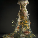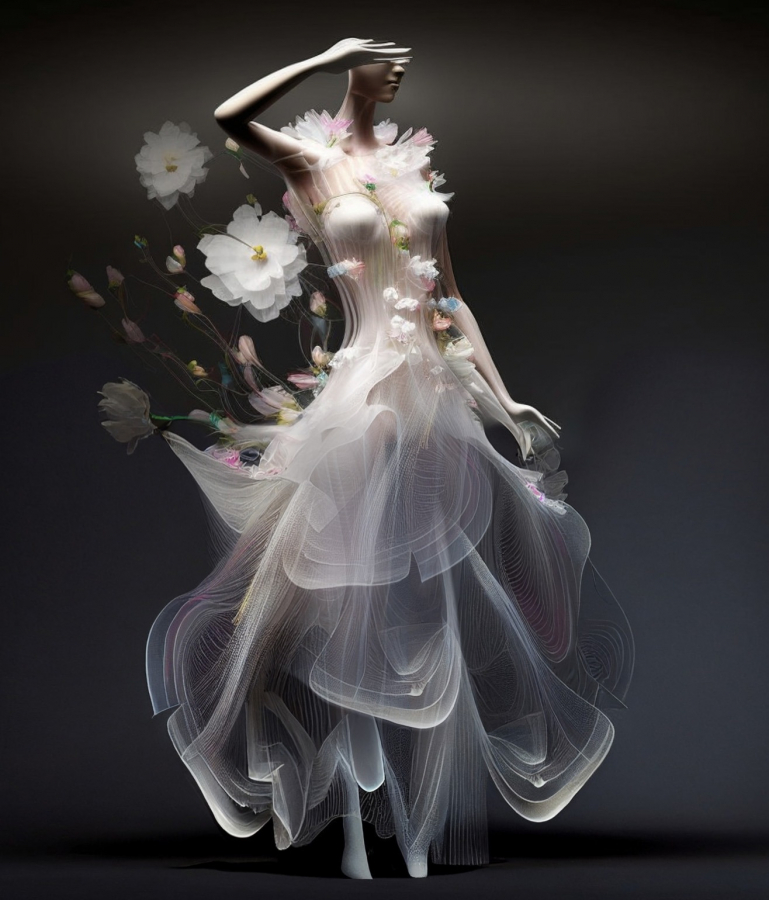 Концепция платья была сгенерирована в нейросети Midjourney по запросу «Современный концепт белого прозрачного платья в футуристическом стиле с распускающимися цветами». В некоторых вариантах добавляли и другие уточнения для большей детализации и проработки. Так нейросеть генерировала платья из стрейч-плёнки, с восточными узорами, драпировкой и голограммами.