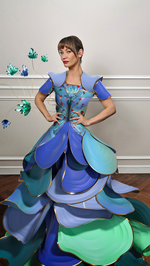 Поэтому запросы в Midjourney видоизменили и постепенно была сгенерирована оптимальная модель, которую «сшили» в программе Clo3D (программа для 3D-моделирования одежды). На создание платья ушло три месяца, а концепция образа менялась не один раз.