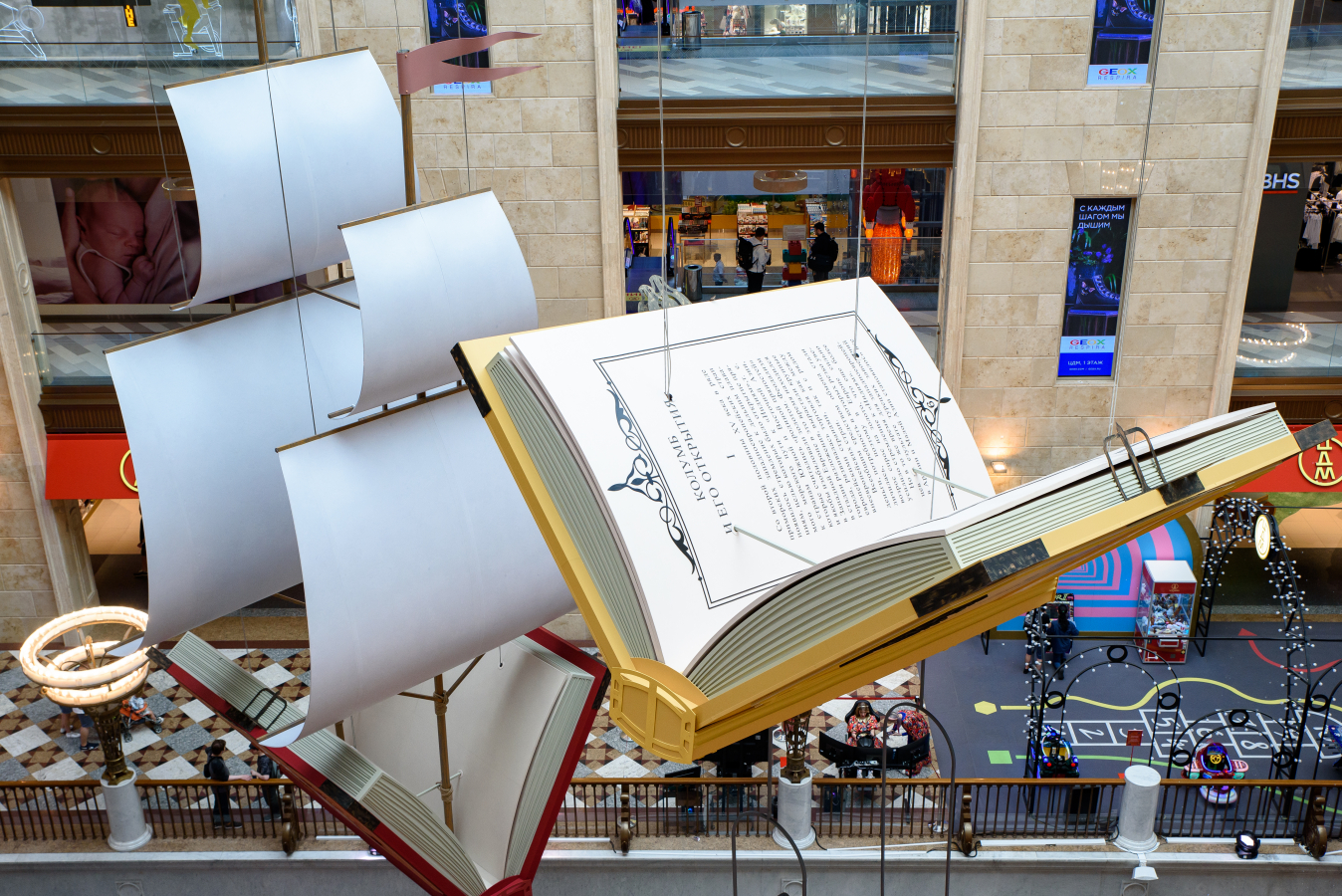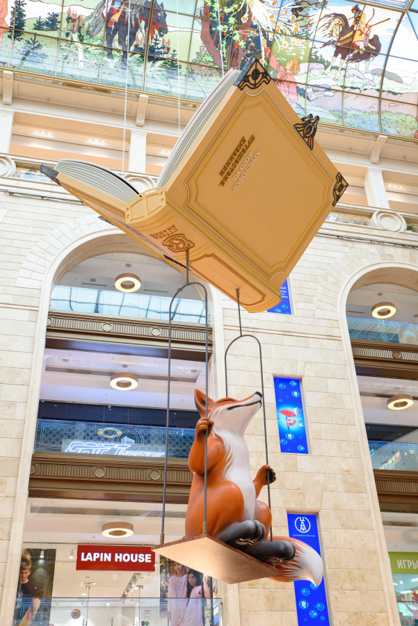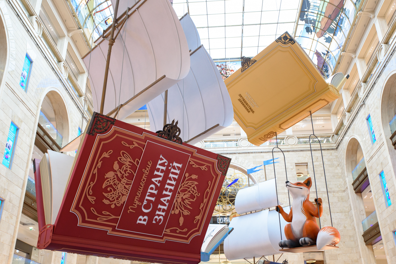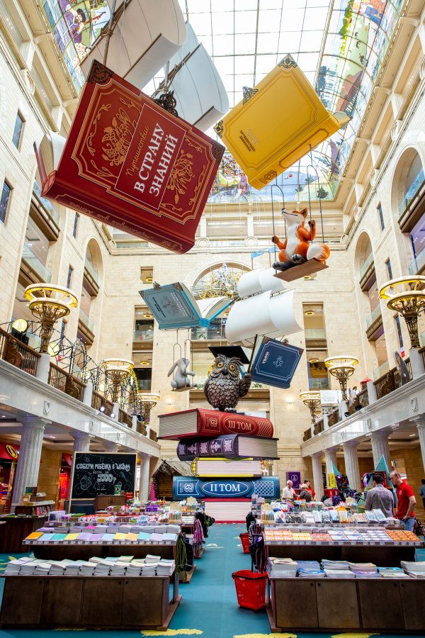 В преддверии нового учебного года главный атриум ЦДМ украсили масштабными арт-объектами в форме книг. Под куполом здания парят гигантские корабли из учебников «Увлекательная наука» и «Страна знаний», а рядом с ними — «летающие книги» в виде томов с произведениями легендарных путешественников Ивана Крузенштерна и Христофора Колумба. Так декорации дополняют ярмарку школьных товаров на первом этаже и фестиваль «Путешествие в страну знаний».