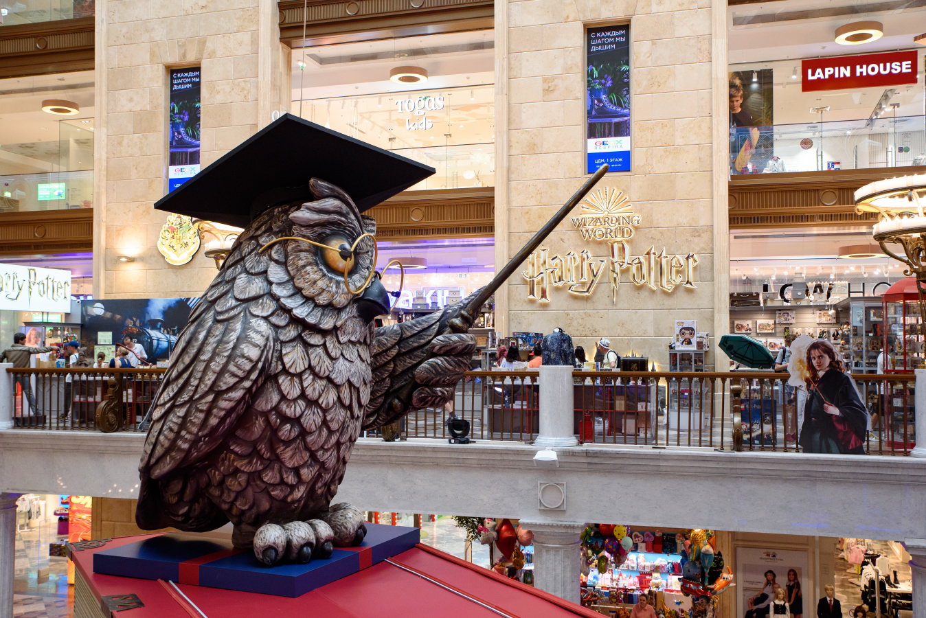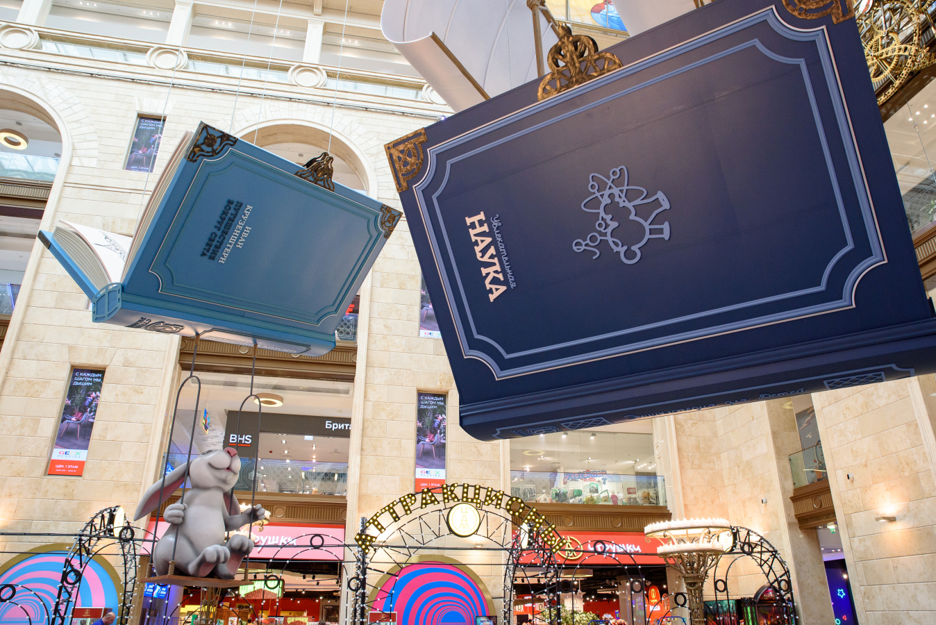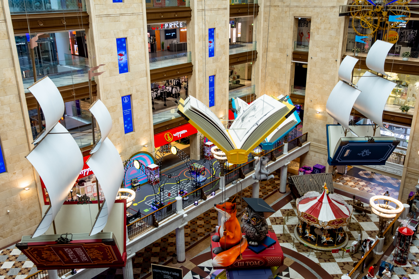 В преддверии нового учебного года главный атриум ЦДМ украсили масштабными арт-объектами в форме книг. Под куполом здания парят гигантские корабли из учебников «Увлекательная наука» и «Страна знаний», а рядом с ними — «летающие книги» в виде томов с произведениями легендарных путешественников Ивана Крузенштерна и Христофора Колумба. Так декорации дополняют ярмарку школьных товаров на первом этаже и фестиваль «Путешествие в страну знаний».