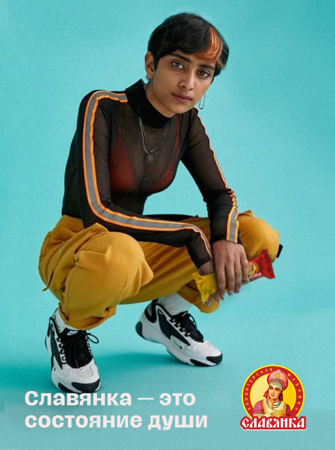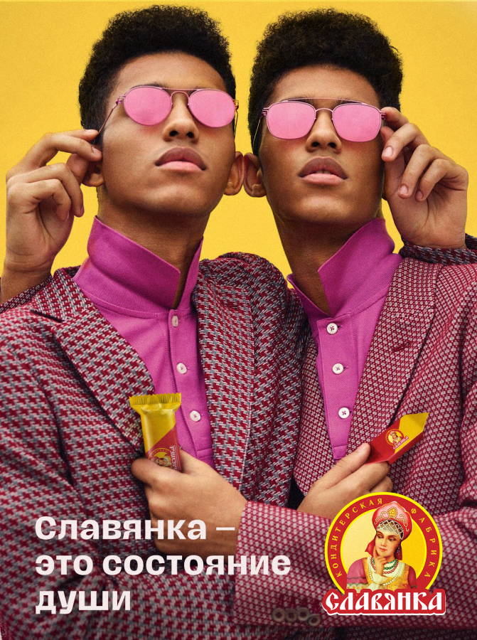 Покажем, что бренд открыт для всех: «Славянка» — это состояние души. Пусть темнокожий парень с маникюром в розовых легинсах смотрит на нас с баннера. «Славянка» бывает разной.