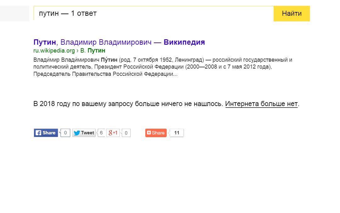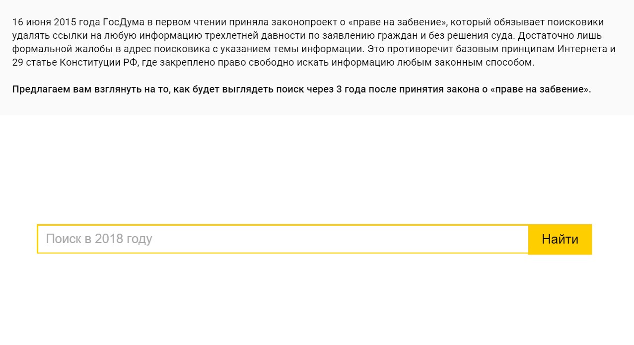"Забвение Интернета" показывает, как будет работать поисковик в России к 2018 году. По запросу о первых лицах государства он выдает только одну ссылку на официальную страницу в Википедии. И ничего не знает об оппозиционных политиках или неугодных властям деятелях культуры.