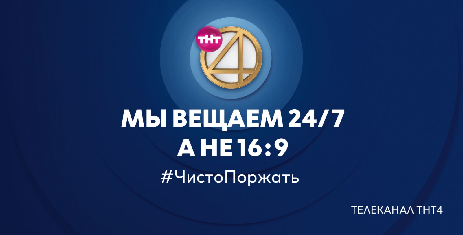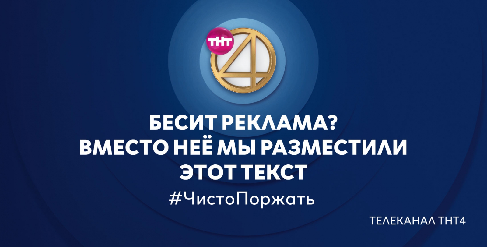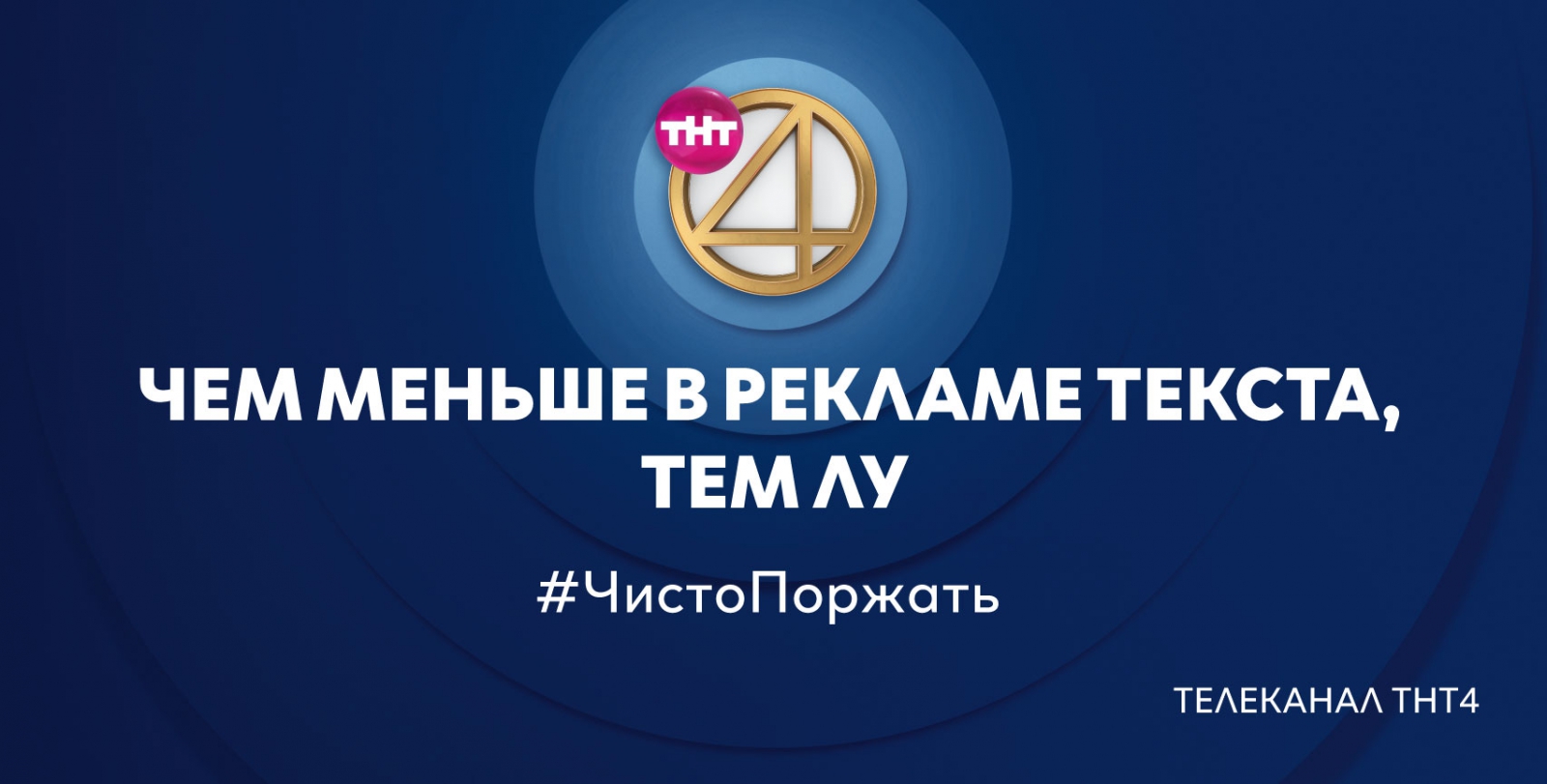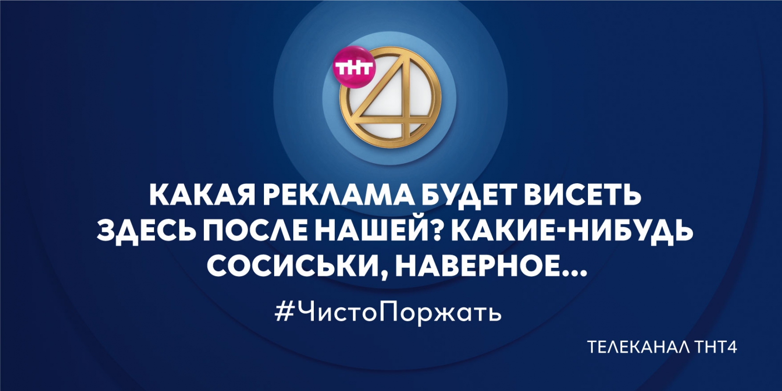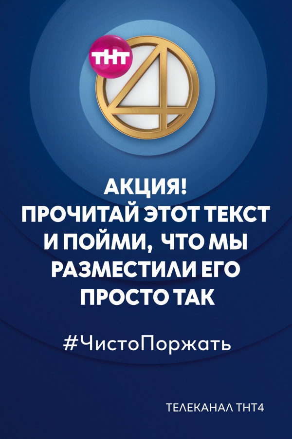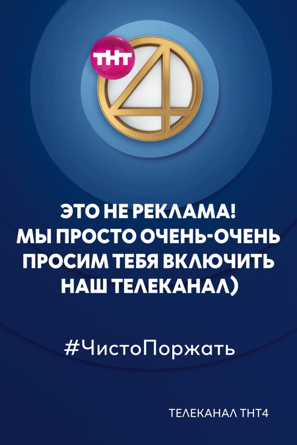 Команда ТНТ4 не пошла такими традиционными путями в создании имиджевой рекламы, как использование слогана, яркий дизайн, перечисление преимуществ. Телеканал позиционирует себя комедийным и развлекательным, поэтому его наружная реклама тоже должна быть смешной, как и эфирный контент. Ничего лишнего — логотип, шутка и «броский» хэштег, соответствующий интернет-сленгу. Для достижения нужного результата ТНТ4 объединились с креативным агентством Possible.