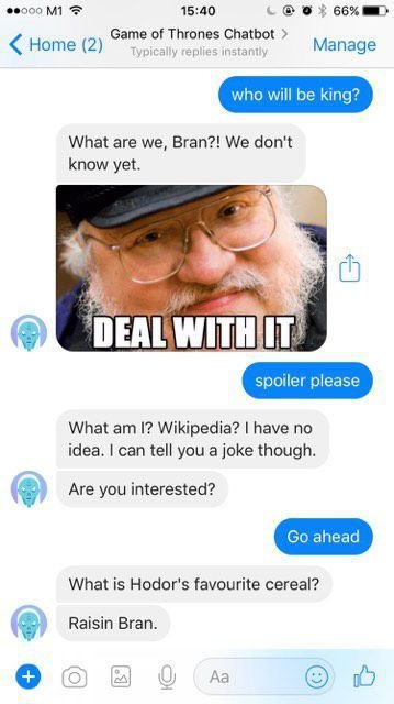 Для ответов на множественные вопросы фанатов сериала британское креативное агентство Catch создало чат-бота (Game of Thrones Chatbot) в мессенджере Facebook. Перед началом сезона зрители могли расспросить бота обо всем, что касается «Игры престолов». Бот отвечал на все интересующие вопросы, включая прозвища Джона Сноу, называл любимую кашу Ходора, высылал изображения детенышей лютоволка и даже отшучивался при просьбах сделать краткий пересказ сериала.