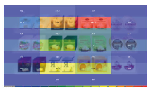 Нашим испытуемым предлагалось свободно рассматривать полки с продукцией в течение 7 секунд. За это время человек успевал пробежаться взглядом по всей картинке, имея возможность вернуться или задержаться на тех пятнах/упаковках, которые привлекли наибольшее внимание. Такая стратегия рассматривания наиболее близка к стратегии, которую покупатель использует автоматически, находясь в магазине.