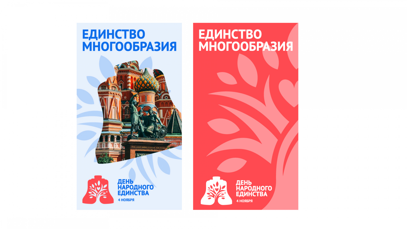 Команда Depot разработала айдентику национального праздника для визуального представления в рамках акции. Логотип — главный айдентический элемент — представляет собой силуэт дерева, заключённого в контур колокола. Колокол — важный и узнаваемый символ русской культуры. Он имеет монументальный характер и отсылает к истории, отражая историческую основу праздника. Дерево — классический и хорошо считываемый образ объединения. Ветви, направленные в разные стороны, но имеющие общие корни, наилучшим образом иллюстрируют идею праздника, выраженную в слогане «Единство многообразия».
