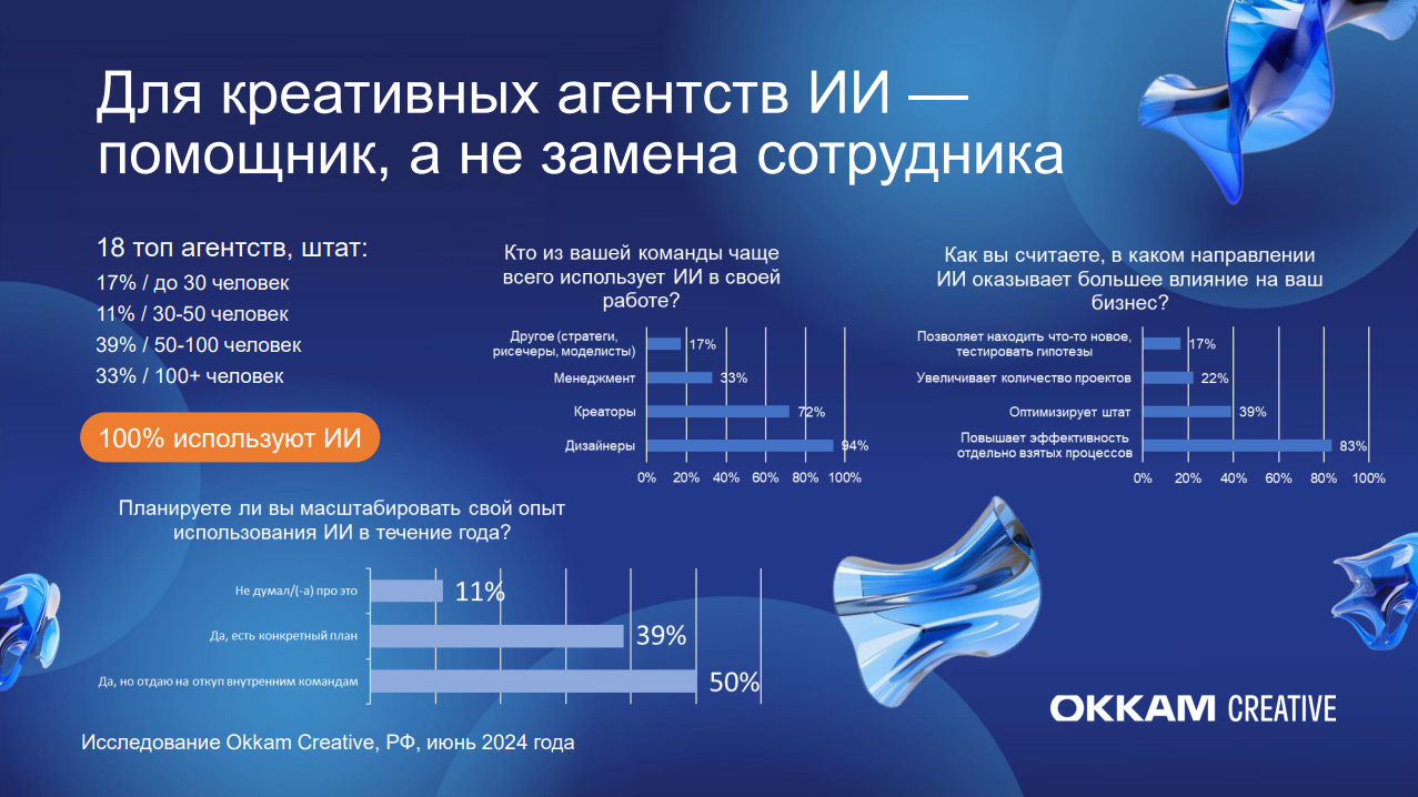 В опросе Okkam Creative участвовали представители 18 компаний. По итогам интервью оказалось, что чаще всего нейросетями пользуются арт-директора (94% опрошенных) и креативные директора (72%). Если говорить про оптимизацию процессов, то только треть (33%) агентств применяют ИИ для написания отчетов, оценки тендеров, формулировки задач. Еще 17% опрошенных используют нейросети для поиска инсайтов, исследования и разработки стратегии.