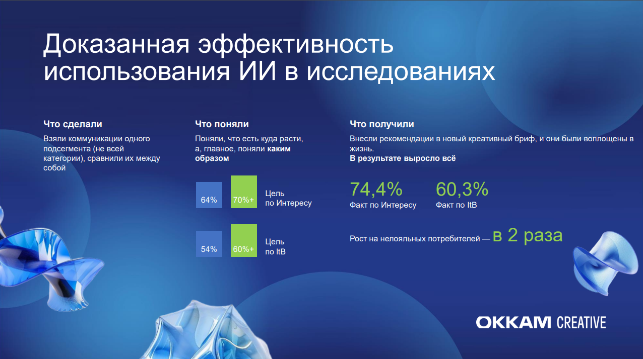 Эффективность такого подхода подтвердилась и во время решения конкретной задачи по улучшению качества роликов одного из клиентов Okkam Creative. На основе инсайтов, полученных от ИИ, команда составила креативный бриф, куда внесла рекомендации по подготовке ролика для клиента. По результатам его тестирования, показатель интереса вырос с 64% до 74%, намерение купить — с 54% до 60%, а лояльность среди нерегулярных потребителей выросла в два раза.