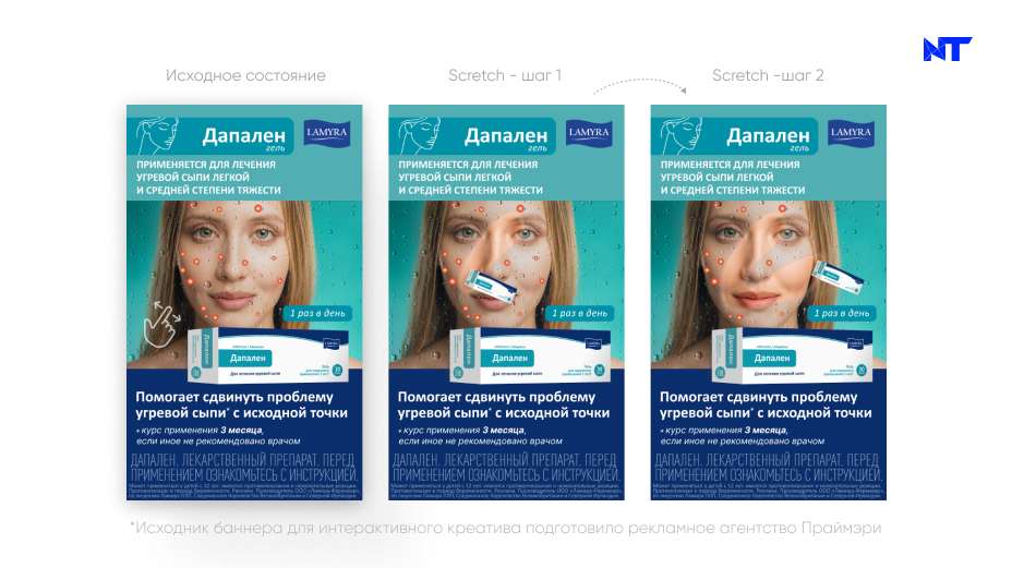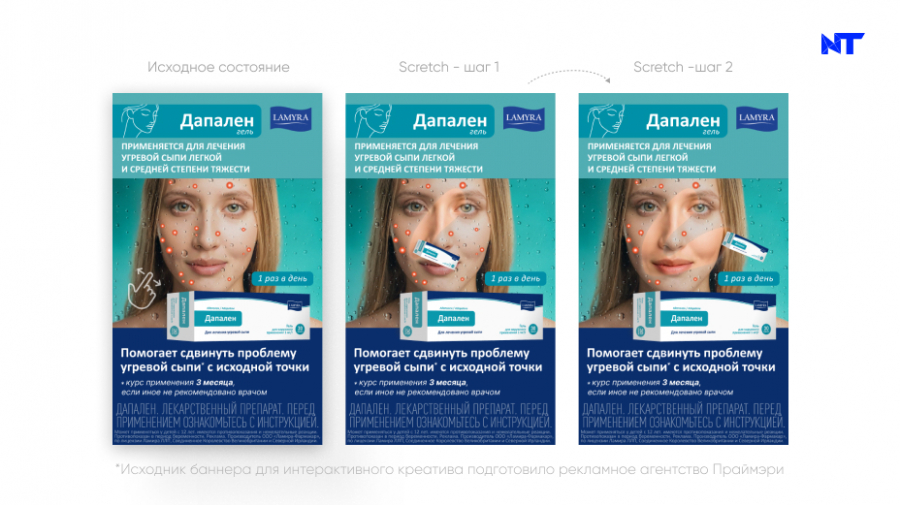 Принцип 6. Комбинируйте статику и интерактив. На фоне перегруженности контентом статичные форматы часто теряются. Интерактивы выигрывают за счет нестандартной механики: пользователь не просто видит рекламу, а взаимодействует с ней. Это увеличивает переходы, время контакта и повышает шансы на запоминание бренда. Например, в рекламной кампании «Дапален» интерактивный scratch-баннер собрал на 412% переходов в среднем больше, по сравнению со статичными форматами.