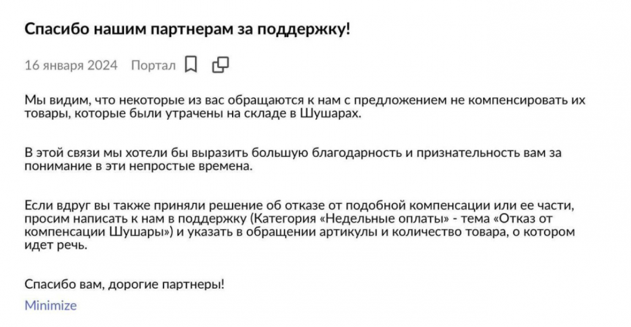 Первая ошибка при ЧП — письмо-предложение «по желанию отказаться от компенсации за сгоревший товар». После пожара продавцы столкнулись с финансовыми потерями, поэтому письмо так и не вызвало ощущения солидарности с маркетплейсом. Напротив, сообщение завирусилось в Telegram-каналах и других соцсетях, и вызвало волну сарказма и нового негатива. А пользователи пытались уличить площадку в игре на жалости.