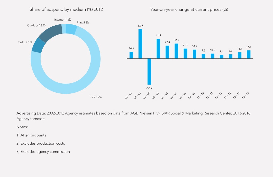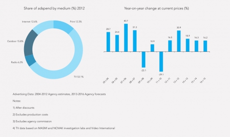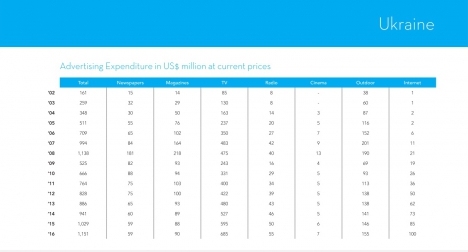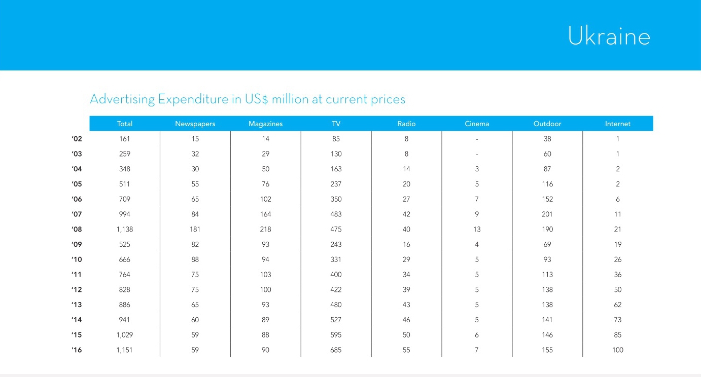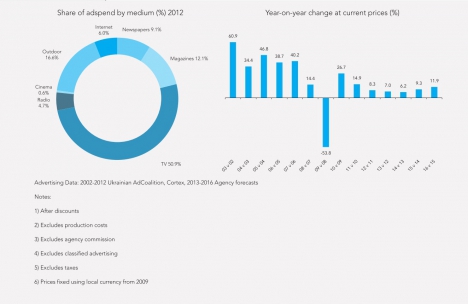 В 2010 году украинский рынок зафиксировал рост в 26,7%, после чего стал неуклонно замедлять темпы рост. Согласно оценке ZenithOptimedia, в 2013 году объем рекламы на Украине вырос на 7%, достигнув 886 млн. долларов.