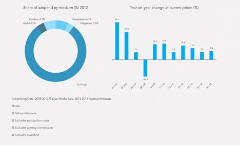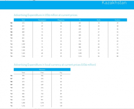 По данным ZenithOptimedia, казахстанский рекламный рынок в 2013 году почти вдвое ускорился по сравнению с 2012 годом – с 7,3% до 14%, достигнув отметки в 1,2 млрд. долларов. Однако по итогам текущего года рынок ожидает замедление до 11,4%, прогнозирует ZenithOptimedia. Впрочем опрошенные Sostav.ru игроки рекламного рынка Казахстана уверены в том, что рынок едва ли покажет рост в 5% в условиях колебания валютного курса и серьезной медиаинфляции.