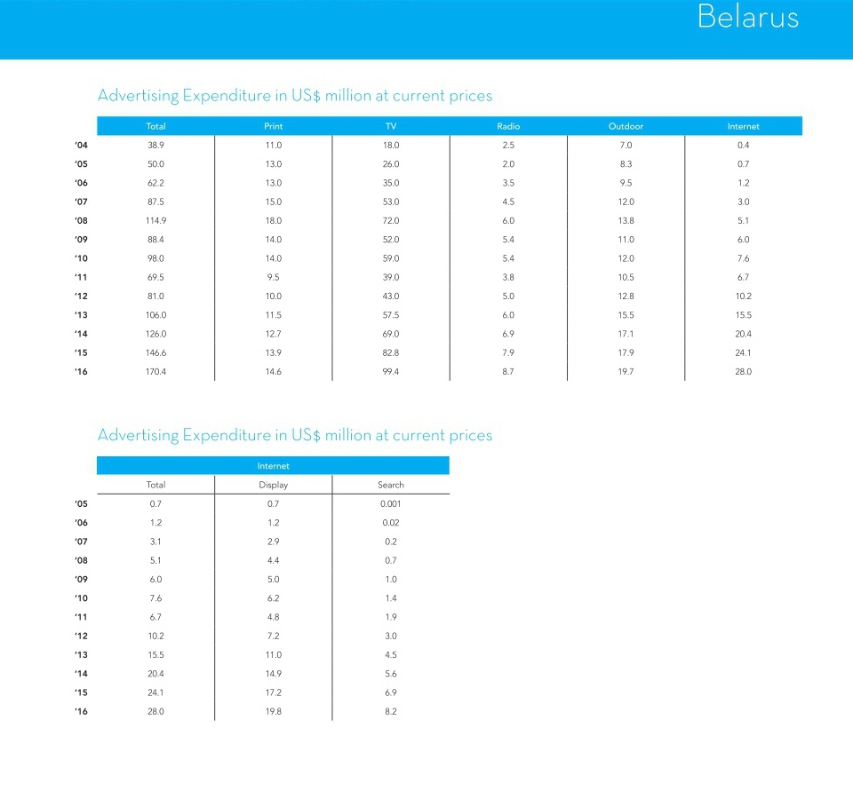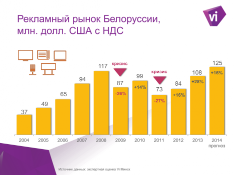 Белорусский рекламный рынок в 2013 году показал скачок роста – с 16,5% до 30,9%. Объем рынка рекламы в прошлом году равнялся 106 млн. долларов, согласно данным ZenithOptimedia. Схожую экспертную оценку предоставил селлер Vi Минск (дочерняя компания Vi в Белоруссии). Оттока рекламных бюджетов на белорусском рынке не наблюдается, отметили представители селлера.
