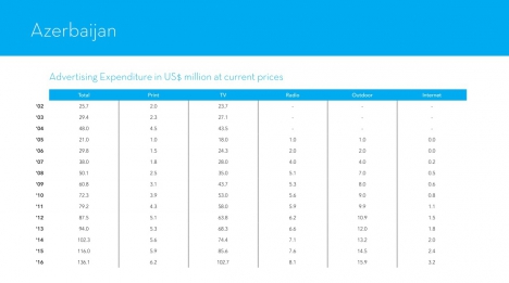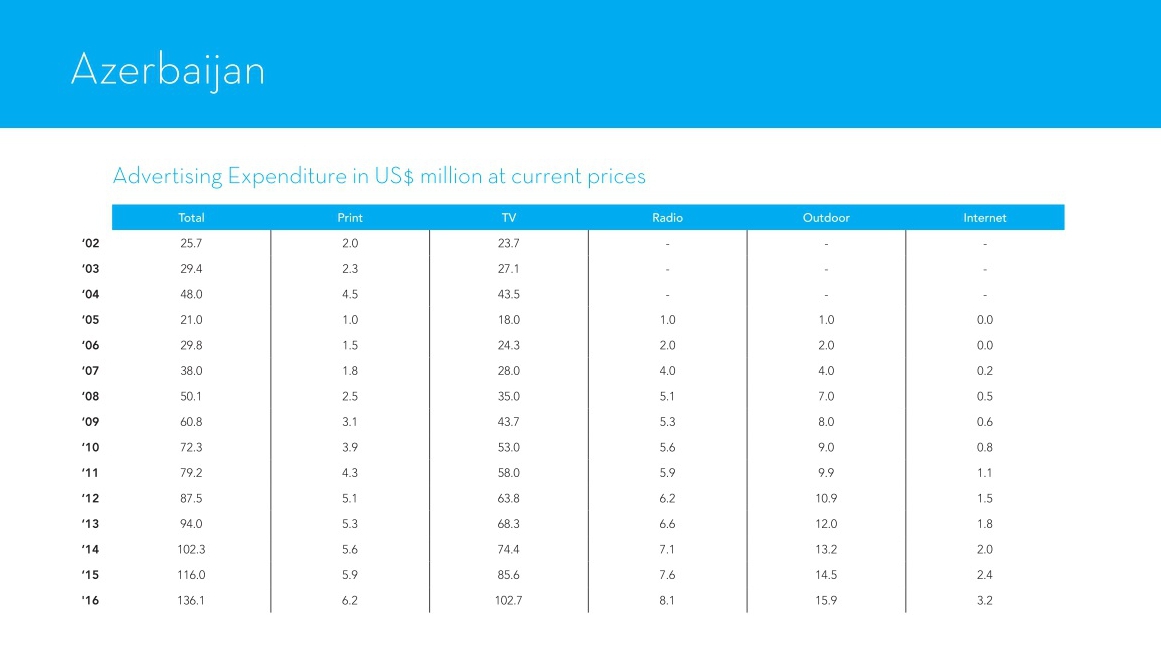 «Рынок развивается уверенно и не реагирует на внешние факторы. Объем медиарынка ежегодно прирастает на 10-15% и составит в 2014 году порядка 110 млн. долларов (нетто). Креативные бюджеты незначительны, практически все международные клиенты ограничиваются адаптациями», - комментирует состояние и перспективы рекламного рынка Азербайджана директор по развитию бизнеса в Центральной Азии и на Кавказе GroupM Михаил Пятин.
