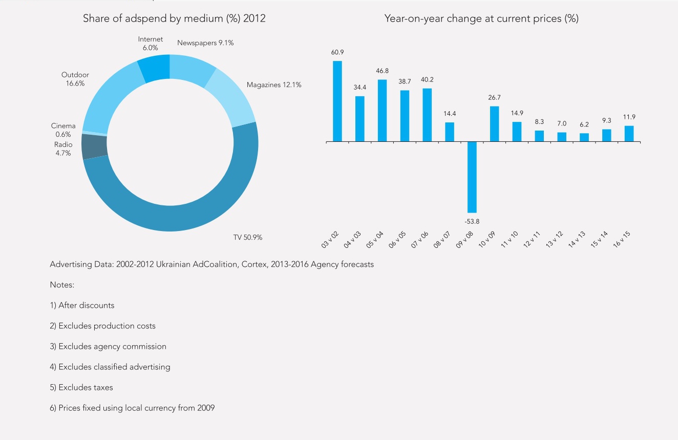 Цены на медиаразмещение традиционно фиксировались в долларах, с 2009 года рынок перешел на цены в гривнах, в результате чего рекламные бюджеты снизились на 15-30% в местной валюте. В этот период на сокращение рекламного рынка повлияло и падение гривны по отношению к доллару.