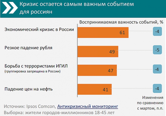 В апреле важность кризиса для россиян продолжила снижаться, число жителей России, которые считают экономический кризис самым значимым событием сократилось с 66% до 61%. Такие данные содержатся в ежемесячном Антикризисном мониторинге компании Ipsos Comcon.