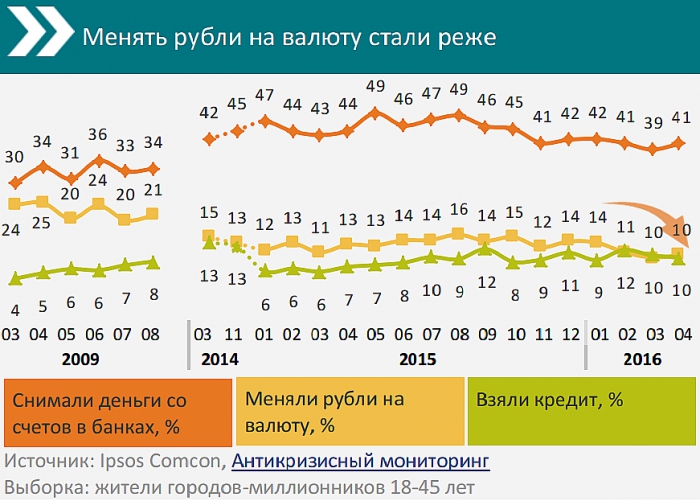 Тем не менее, рост цен заставляет людей по-прежнему экономить на покупках. В финансовой сфере россияне продолжают с осторожностью подходить к оформлению кредитов. Снимают деньги со своих счетов около 41%, при этом в основном на текущие расходы. А вот обменивать рубли на валюту стали реже, в апреле это делал только каждый десятый россиянин, несмотря на её ослабление.